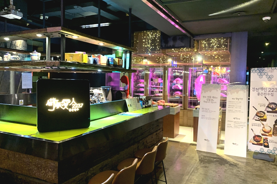 경천애인2237 여의도점은 지하철 9호선, 신림선, 샛강역 1번 출구 부근에 있다. 매장이 있는 sk증권빌딩 내에 자체 주차장이 있어 방문 시 자동차로 이용하기 편리하다. 경천애인의 특징은 깔끔한 카페식 분위기와 레스토랑 인테리어로 합리적인 가격의 최고급 한우를 즐길 수 있는 한우전문점이다. 단체석과 개별 룸도 완비되어 있고 농림축산식품부 제공 안심식당으로도 인증받은 곳이다. 대표 메뉴로는 특안심, 스페셜육회가 있고 그 외 메뉴로 꽃등심, 경애등·안·채, 소갈비살, 치마살, 설화살치살, 일품채끝이 잘 나간다. 주변에 여의도 샛강생태공원, 여의도한강공원이 있어 식사 전후에 산책하기에 좋다.