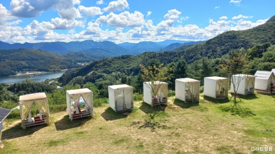 라틴정원은 가평군에 있는 카페로 산 중턱에서 북한강을 즐길 수 있는 카페이다. 이 카페의 장점은 방갈로가 많아 개인별로 방갈로를 배정받아 프라이빗하고 편안한 시간을 보낼 수 있는 것이다. 넓은 정원에도 방갈로를 널찍하게 배치했고, 본관 1층은 방갈로로, 2층은 카페로 만들었다. 방갈로에는 에어콘, 선풍기도 있고, 겨울에는 난방이 된다. 2~3명이 누울 정도의 크기여서 편안히 쉴 수 있고, 넓고 쾌적한 캠핑카도 있다. 메뉴는 커피류, 음료류, 디저트류를 판매하고 정원카페에서 피자와 치킨을 먹을 수 있다. 야외에서는 한강라면 세트도 인기다. 한강라면 세트는 셀프이며 김치와 계란이 제공된다. 주차는 넓은 주차장이 있어 편리하게 이용할 수 있고, 인근에 호명호수공원, 호명호수, 쁘띠프랑스 등이 있다.