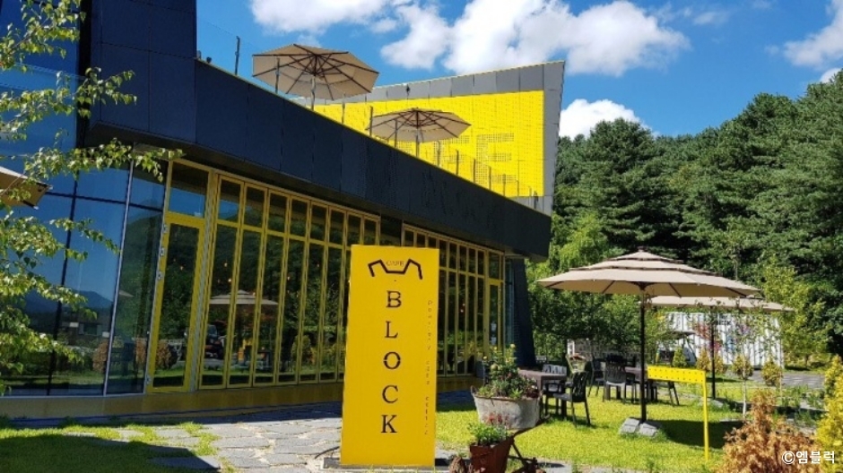 엠블럭은 아침고요수목원에서 차로 3분 정도 거리에 있는 자동차 갤러리 카페이다. 1, 2층을 합쳐서 660㎡ 규모의 건물을 모두 운용하는 대형 카페이다. 반려견 동반이 가능한 카페인데 일반인과 반려견을 동반하는 손님의 공간을 분리해서 이용할 수 있다. 외부에 반려견 운동장도 있고, 반려견을 위한 댕댕이 버스도 운영하고 있다. 실제 빈티지 자동차를 활용해서 인테리어를 했다. 분위기도 독특하고 창문이 크고 높아서 시원한 느낌을 준다. 외부 인테리어도 버스를 이용해 쉴 곳과 볼 곳을 동시에 마련했다. 메뉴는 커피류와 차류, 주스류가 있는데 커피는 최상급의 스페셜티 커피를 판매하고 있고, 메이플 크로플, 치즈토스트, 눈꽃우유팥빙수도 인기 메뉴다. 인근에 백련사, 잣향기푸른숲 유아숲체험원 등이 있다.
