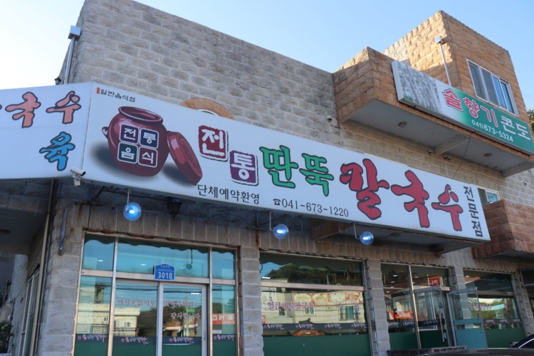 전통딴뚝칼국수는 충청남도 태안군 안면읍 승언리에 있다. 깔끔한 외관과 예스러운 분위기의 인테리어가 눈에 띈다. 내부에는 단체석이 마련되어 있어 각종 모임을 하기 좋다. 대표 메뉴는 해물칼국수를 비롯해 수육, 만두, 음료수 등이 나오는 해물칼국수세트다. 육수는 45년 된 씨간장을 이용해 2년 이상 숙성한 된장을 사용한다. 주재료인 콩은 직접 재배한 국산이며, 소금은 안면도 천일염으로 5년 이상 간수를 뺀 것을 사용한다. 홍성IC에서 가깝고, 인근에 꽃지해수욕장, 안면도자연휴양림이 있다.
