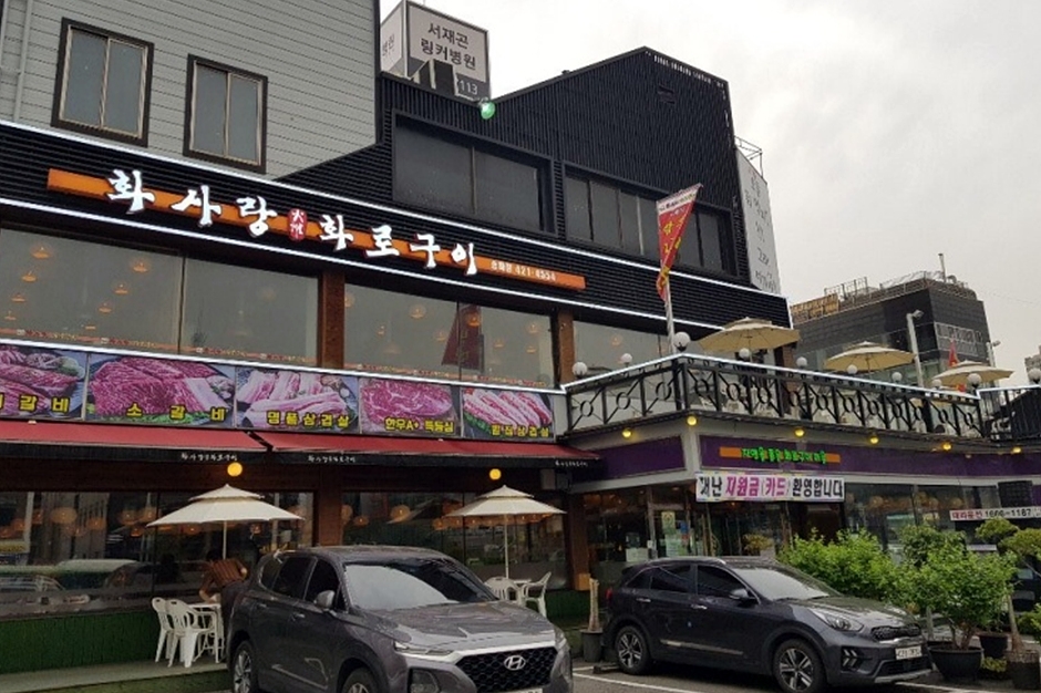 화사랑화로구이 송파점은 9호선 송파나루역 4번 출구 방이사거리 옆에 있다. 넓은 주차 공간이 있어 이용이 편리하다. 매장 내부는 조명을 많이 사용해 밝고, 깔끔한 인테리어에 1, 2층이 모두 식당이다. 어린이를 위한 놀이공간이 제공되어 편안한 식사를 할 수 있다. 대표 메뉴는 돼지갈비, 멍석갈비, 명품생갈비가 있고, 평일 점심 특선으로 갈비 정식 메뉴가 있다. 점심 식사 메뉴로 갈비탕, 강된장 비빔밥, 김치찌개, 냉면 등이 있다. 고기를 주문하면 쌈 채소와 도토리묵, 명이나물, 파무침, 풋고추된장무침 등이 밑반찬으로 나오고 불은 숯불을 사용한다. 후식으로 삼색 아이스크림이 있어 입가심하기 좋다. 식당 인근에는 석촌호수, 대형 테마파크 놀이동산이 있어 연계 관광을 할 수 있다.