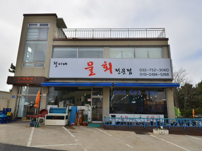 철이네물회전문점은 인천광역시 중구 덕교동에 있다. 신선한 회를 푸짐하게 얹어 새콤달콤 시원하게 국물까지 먹을 수 있는 물회, 회덮밥 전문점으로 외부에는 신선한 해산물이 있는 수족관이 있으며 야외 테이블도 마련되어 있다. 주차는 음식점 바로 앞에 할 수 있다. 이곳의 대표 메뉴는 모듬물회 2인, 활우럭매운탕 2인이다. 밑반찬은 김치, 어묵볶음, 고추장아찌 등 4가지가 제공되고 물회는 작은 그릇이 아닌 빙수 그릇을 연상케 하는 큼지막한 그릇에 푸짐하게 담겨 나온다. 그 외 메뉴는 활우럭지리탕 2인, 광어물회 2인, 한치물회 2인, 간재미물회 2인, 연어물회, 바담모둠물회 2인 등 다양하다. 식당은 농림축산식품부 제공 안심식당이다. 인근에 용유하늘전망대, 마시안어촌체험휴양마을, 거잠포선착장, 실미도유원지 등이 있어 연계 관광을 즐길 수 있다.