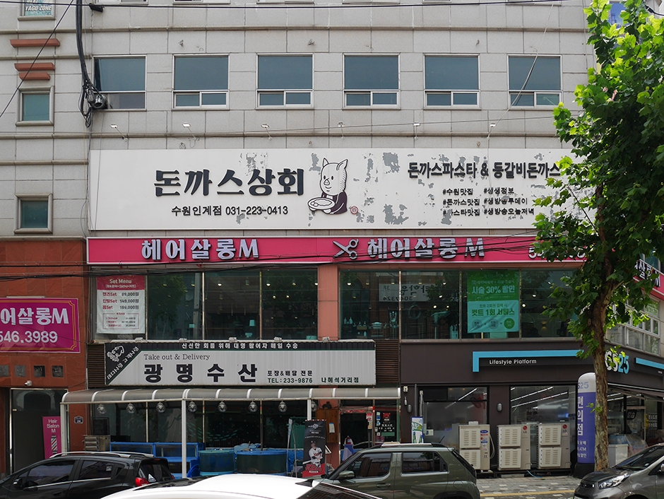 돈까스상회 수원인계점은 경기도 수원시 팔달구 인계동 나혜석 거리에 있는 돈가스 전문점이다. 3층 전체가 매장인 이곳은 넓은 홀에 여러 인원을 수용할 수 있는 다양한 테이블로 구성되어 있다. 이 식당은 항시 대기가 있어 기다리는 고객을 위한 대기석이 따로 마련되어 있다. 또한 아기자기한 소품들을 진열해 판매도 하고 있다. 돈까스상회 수원인계점은 매일 아침 입고되는 신선한 국내산 냉장 생등심을 사용하고 신선하고 좋은 식재료에 직접 소스를 만들어 사용한다. 기본 정식 메뉴부터 2인, 3인, 4인용 세트 메뉴가 저렴하게 구성되어 있고 반찬 식기류는 메뉴와 함께 제공된다. 매장 한쪽에는 셀프바에 추가 반찬, 식기류와 셀프 포장을 할 수 있는 포장지가 구비되어 있다. 근처에 수인분당선 수원시청역이 있어 대중교통 이용이 편하다.