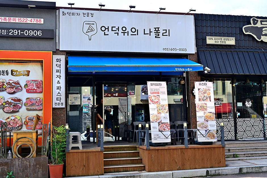 화덕피자 전문점 언덕위의나폴리는 창원 중동에 있다. 내부는 그리 크지 않은 규모로 양쪽에 각 6개의 테이블이 마련되어 있는 피자 맛집이다. 피자 외에도 샐러드, 봉골레, 까르보나라, 버섯베이컨토마토, 해산물토마토, 해산물크림, 새우날치알토마토, 베이컨필라프, 깔조네샐러드, 버섯샐러드 등 다양한 메뉴가 있다. 각 메뉴는 맵기 조절이 가능하여 어린이와 함께 오기도 좋다. 피자와 함께 인기가 많은 리코타깔조네샐러드도 추천하는 메뉴 중 하나이다. 직접 만든 리코타와 신선한 채소, 치즈와 꿀이 들어간 빵이 나온다. 주말과 점심시간에 예약하지 않으면 대기 시간이 발생할 수 있고 당일 예약은 할 수 없다. 식사 후 근처 걷기 좋은 사화공원도 있어 함께 둘러보면 좋을 것 같다.