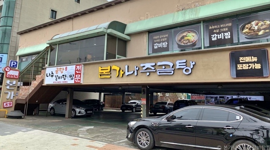 본가나주곰탕갈비탕찜은 경기도 안양시 관양동에 있는 곰탕 전문점이다. 내부는 넓고 테이블도 넉넉하며 단체 손님을 위한 공간도 있다. 이 음식점의 나주곰탕은 2배 비싼 구이용 부위를 사용하여 옛날 비법으로 조리한다. 국물이 깔끔, 담백하면서도 고소하고 깊은 맛이 난다. 고기는 아주 부드럽다. 갈비탕과 찜은 마구리 없이 순수 갈비 부위만 사용하므로 살코기가 실하다. 갈빗살이 쉽게 잘 발라지고 아주 부드럽다. 육전이 매우 인기 있는데, 특수부위인 부챗살을 이용하여 전을 부친다. 고기의 육향과 계란의 고소함이 어우러져 손님들이 꼭 주문하는 특별한 별미다. 식으면 묵이 될 정도로 고농도인 도가니탕도 대표 메뉴다. 체인점이 아닌 개인이 운영하는 음식점이다. 본가나주곰탕갈비탕찜은 모든 메뉴를 나주 출신의 주인이 직접 조리한다. 반찬으로 나오는 김치와 깍두기도 감칠맛을 내 주메뉴와 잘 어울린다. 근처에 동편마을 카페거리와 공원들이 많이 있고, 5km 이내에 평촌 중앙공원, 백운호수, 삼막사 계곡, 관악산 등이 있다.