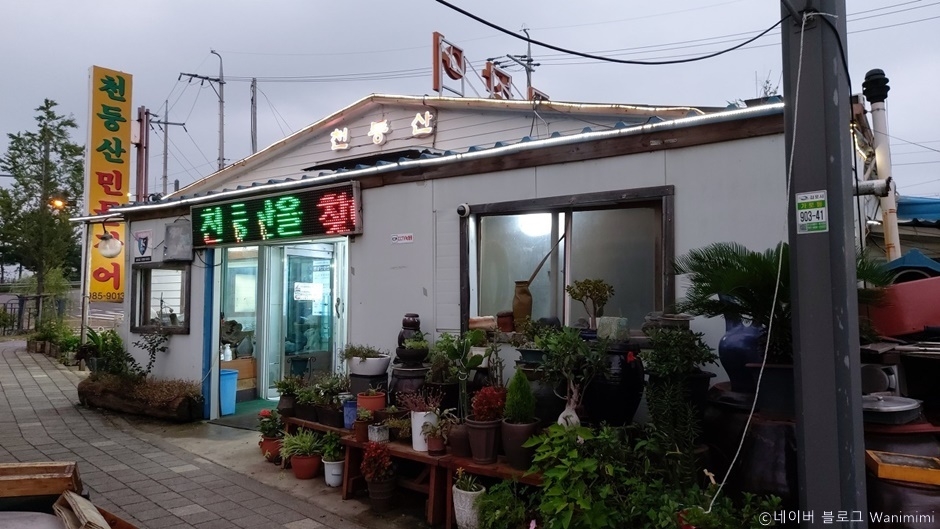 천둥산 민물장어는 김포도시철도 고촌역과 풍무역 중간에 있다. 민물장어 정식으로 소문난 맛집으로 간판이나 메뉴에는 천등산이라고 되어 있는데, 인터넷이나 SNS에서는 천둥산으로 더 많이 검색되고 있다. 민물장어 정식은 철판에 구워진 장어를 제공하여 구워 먹는 불편함이 없다. 장어 정식 외 간장 게장, 버섯 불고기, 된장찌개 등 다른 메뉴를 선택할 수 있다. 6,600여㎡(2,000평)에 이르는 넓은 정원에선 다양한 꽃을 볼 수 있고 물레방아가 돌아가며 오골계와 토끼를 사육해 눈길을 끈다. 또한 식사 후에는 마당에 모닥불을 피워 놓고 정담을 나눌 수 있어 시골로 나들이 온 분위기를 즐길 수 있다.