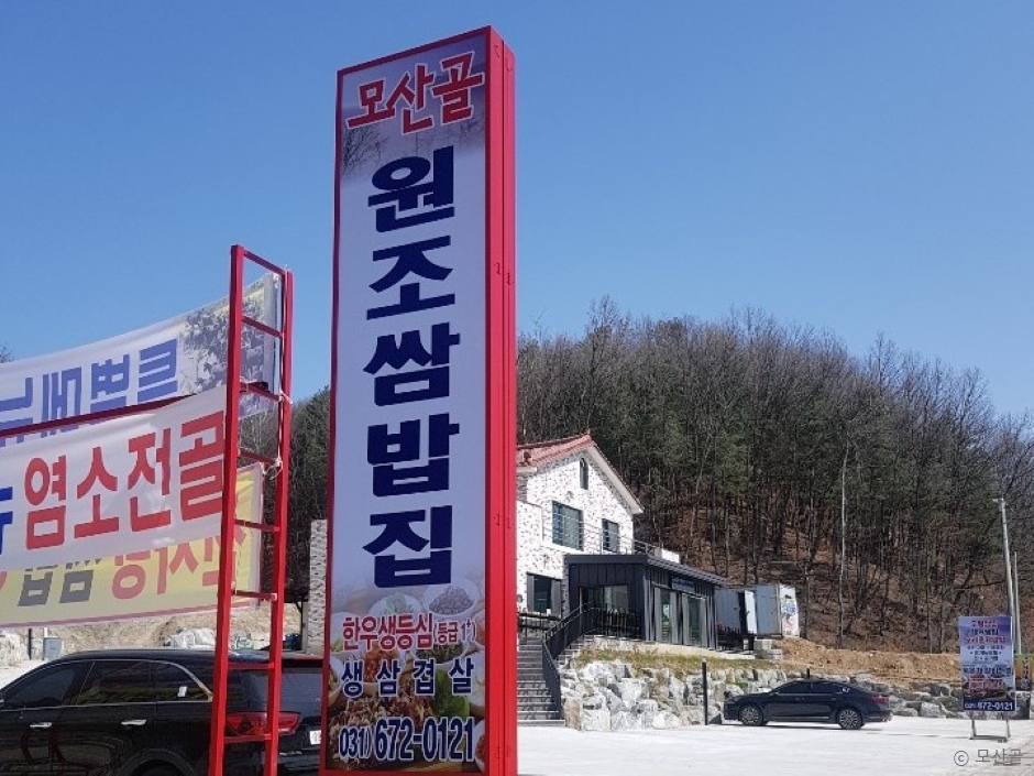 모산골은 경기도 안성시 금광면 삼흥리에 있는 한식당이다. 대표 메뉴는 고추장불고기(2인)+우렁쌈밥(2인) 메뉴이다. 이외에도 쌈밥정식(4인), 묵은지 등갈비찜 등 한식 메뉴를 판매하고 있다. 한우 생등심, 삼겹살과 같은 고기구이도 판매한다. 매장 내부는 넓고 쾌적하다. 매장 앞에 넓은 주차 공간이 있어 편하게 이용할 수 있다. 안성 베네스트CC에서 약 1.5km 떨어져 있다.