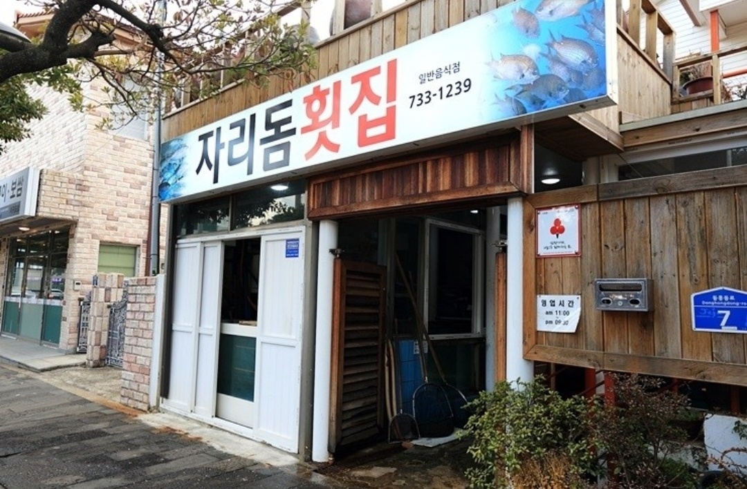 자리돔횟집은 서귀포 시내에 있다. 싱싱함의 척도인 고등어회를 주메뉴로 하며 크고 널찍하게 썰어 나와 비리지 않고 고소하다는 평을 받는다. 여름에는 자리물회와 한치물회, 겨울에는 방어회를 맛볼 수 있으며 양이 푸짐하여 가성비 맛집으로 소문나 있다. 싱싱한 한치를 맛있는 양념국물에 넣어 나오는 한치물회도 별미고, 고등어구이, 우럭돔매운탕, 고등어조림, 우럭조림 등도 맛볼 수 있다. 근처 여행지로 새연교, 삼매봉 공원 등이 있다.