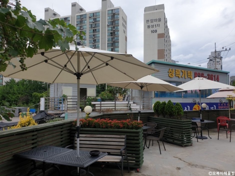 오복이해물찜은 용인 수지에 있는 가성비 좋은 해물찜 식당이다. 주메뉴는 해물찜, 해물탕이고, 아귀만 원할 경우 아구찜만 주문할 수 있다. 찜을 주문하면 정갈하게 차려주는 반찬상만으로 상이 가득하다. 모든 반찬은 리필이 가능한데 부추전만 2천 원을 별도로 받는다. 찜을 다 먹은 후에는 볶음밥을 주문하면 남은 양념을 가져가 조리해서 가져다준다. 식당 내부가 널찍하고 좌식과 입식이 같이 있어 편한 대로 선택하면 된다. 주차장이 좁으면 건너편 동사무소 주차장 이용이 가능하다. 죽전 체육공원 근처여서 운동을 한 후 한 끼 식사를 위해 방문하기 좋다. 주변에 아파트 단지가 많아 지역 주민들의 방문도 많은 편이고, 넓어서 주변 직장인들의 회식 장소로도 좋다.
