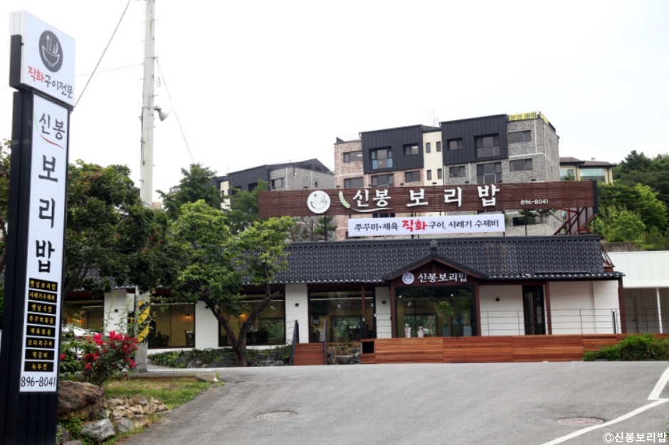 신봉동 외식타운에 위치한 신봉보리밥은 내부가 깨끗하고 넓은 한식 식당이다. 주변에 광교산이 있어 광교산 등산 후에 점심을 먹기 좋은 집이다. 주메뉴는 7가지 나물을 넣어 고추장, 참기름을 넣어 비벼 먹는 보리비빔밥이다. 밥이 아닌 식사를 원한다면 항아리 수제비도 별미다. 곁들여 주문할 수 있는 제육볶음과 쭈꾸미볶음은 주문과 동시에 조리해서 직화구이로 불맛을 내어 보리비빔밥에 넣어 같이 비벼도 맛이 좋다. 참기름은 직접 짜서 식탁마다 놓여 있는데 고소함이 제대로다. 같이 제공하는 된장찌개는 북어머리, 디포리, 보리새우, 멸치, 다시마, 무, 대파로 육수를 내어 끓인 것인데 비빔밥에 몇 숟가락 넣으면 풍미를 높여준다. 주차는 건물 앞에 있는 전용 주차장에 해도 되고, 공용 주차장을 이용할 수도 있다.