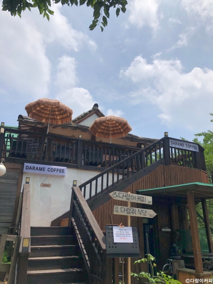 용인 처인구 모현에 있는 도토리 전문 음식점 깊은산속다람쥐 2층에 있는 디저트 카페이다. 깊은 산길을 따라 올라가야 입구를 만날 수 있다. 도착해서는 넓은 주차장에 불편함이 없으나 올라가는 산길이 비좁은 편이다. 갈월저수지를 바로 끼고 있어서 분위기가 좋다. 1층에서 식사를 한 후 자연스럽게 2층 다람이커피로 이동하는 동선이다. 실내를 동남아풍으로 꾸며 놓았고 신발을 벗고 편히 앉아 이야기를 나눌 수 있는 좌식 공간과 입식 공간을 구분해 두었다. 곳곳에 포토존을 꾸며 놓아 사진으로 추억을 남길 수 있다.