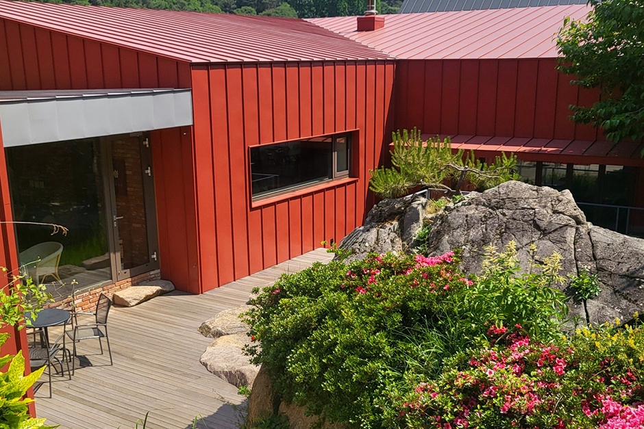 초록의 자연 속에서 차 한 잔의 여유를 즐길 수 있는 부산 범어사 인근 숲속 카페 더팜471은 검은색과 자줏빛 징크로 조화를 이룬 카페 외관이 모던하고 세련된 느낌을 준다. 야외 공간도 깔끔하고 잘 가꾸어져 있다. 주차장 또한 여유롭고 친환경적이다. 주변에 범어사가 있어 나들이 삼아 함께 둘러보기 좋다. 부산 데이트 카페로 이미 유명하며 애플 유자차, 브라우니 케이크, 우유 크림빵 등이 인기 메뉴이다. 자연 뷰를 만끽하며 나무 그늘에서 맛있는 음료와 베이커리를 편안하게 즐길 수 있는 곳이다.