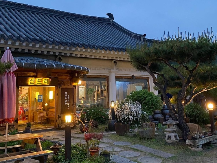 산드레는 경상북도 경주시 하동에 있다. 고풍스러운 외관과 깔끔함이 돋보이는 인테리어가 눈에 띈다. 대표 메뉴는 수제 떡갈비, 튀김, 삼백초 보쌈, 두부강정, 잡채, 전, 샐러드 등이 나오는 우슬초 정식이다. 이 밖에 금은화 정식, 백복령 정식, 하수오 정식 등을 맛볼 수 있다. 단품 요리로는 버섯탕수 등이 있다. 개인 솥 밥에 밥을 퍼내고 물을 부어두면, 누룽지를 후식으로 즐길 수 있다. 내부에는 단체석이 마련되어 있어 각종 모임을 가지기 좋다. 프라이빗한 룸도 준비되어 있다. 농림축산식품부가 인정한 안심식당이다. 예약은 안되고 선착순 입장이다. 남경주IC에서 가깝고, 인근에 불국사와 석굴암이 있다.