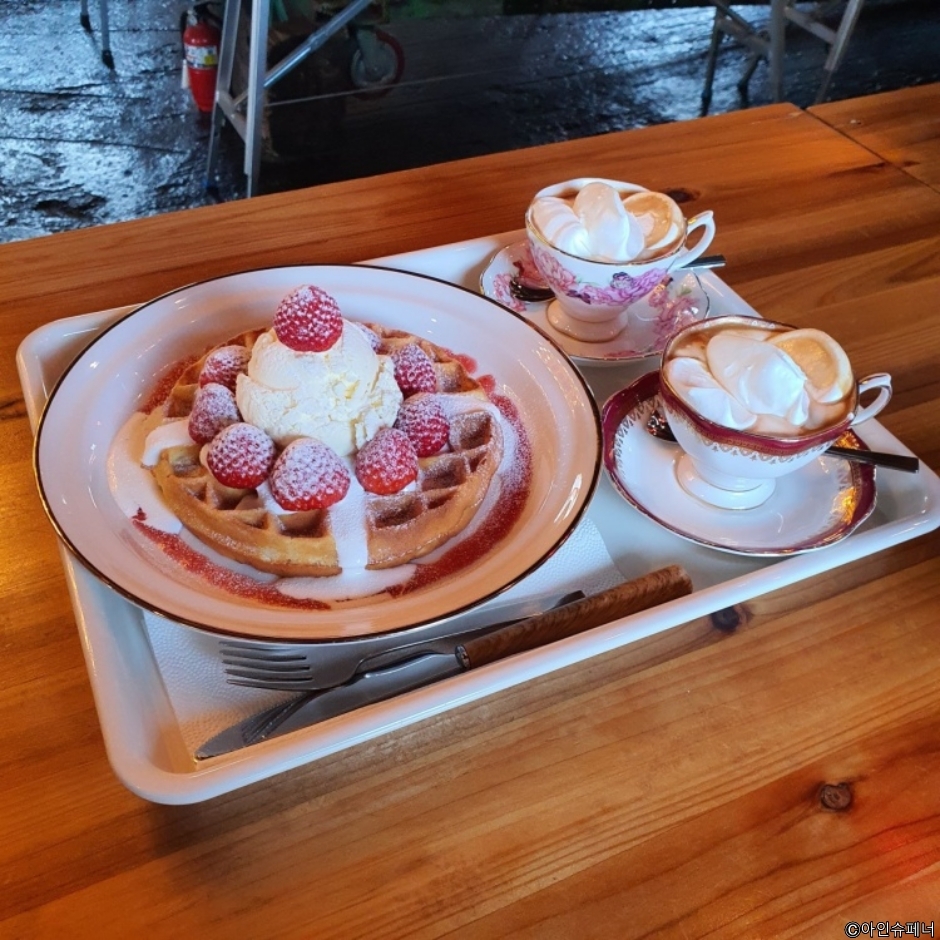 ‘남는 건 사진뿐“이라는 슬로건을 내걸고 카페 한쪽을 사진관 벽면 삼아 흑백사진을 유료로 촬영해 주고 있다. 대표 메뉴는 긴 가래 떡 모양의 이탈리아 정통 수제 티라미수가 있고 신선로에 담아 나오는 신선로 생 망고 빙수가 있다. 수제 생크림을 올린 아인슈페너와 딸기 생크림 와플도 인기다
