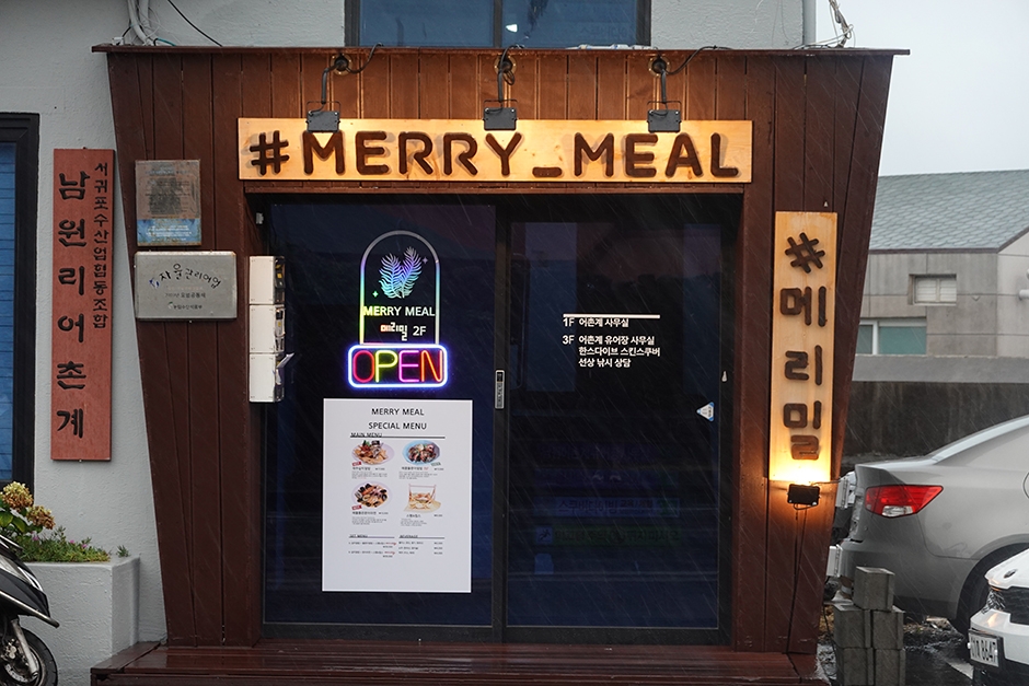 메리밀(Merry_Meal)은 제주 남원 포구 남원어촌종합관 건물 2층에 있다. 제주산 갈치, 딱새우, 전복, 문어 등을 이용하여 자체 개발한 레시피의 덮밥 메뉴를 제공하는 오션뷰 식당이다. 갈치덮밥의 경우 살을 발라 튀기고 뼈를 통째 둥글게 말아 튀겨 특제 소스를 뿌린 밥 위에 올려 내온다. 갈치는 뼈까지 먹을 수 있으며 반숙 계란, 초록과 붉은색으로 튀긴 팽이버섯도 이색적이다. 주변 여행지로 남원항, 남원큰엉해변, 쇠소깍 등이 있다.