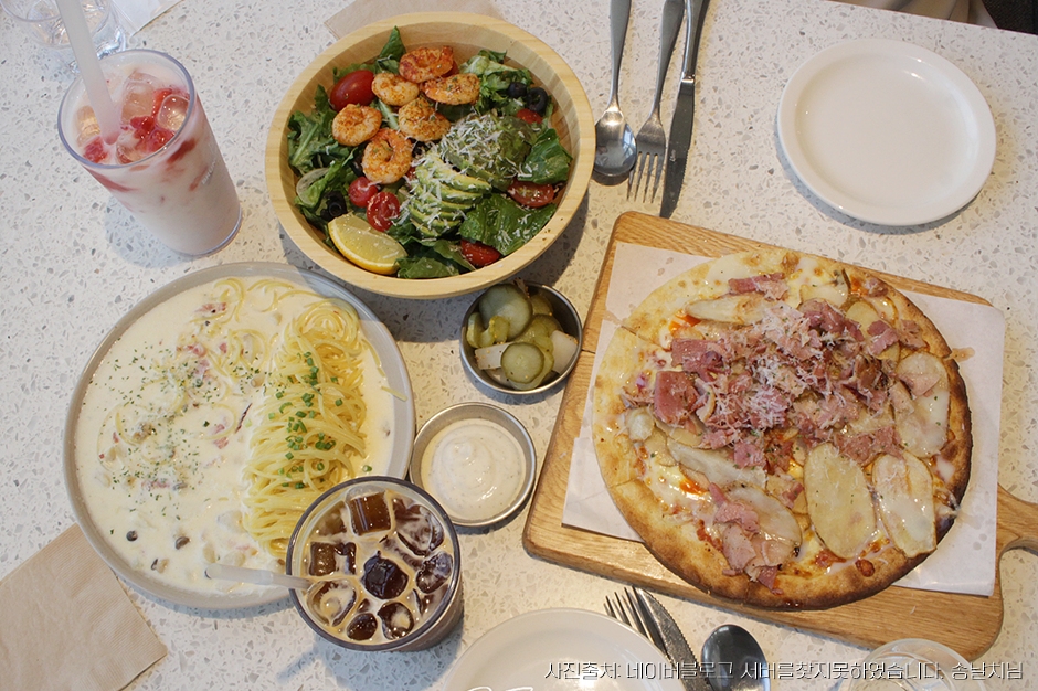 - 취급메뉴 : 샘플러, 미트러버, 스파이시쉬림프파스타, 아이스아메리카노, 생오렌지쥬스, 블루레몬에이드