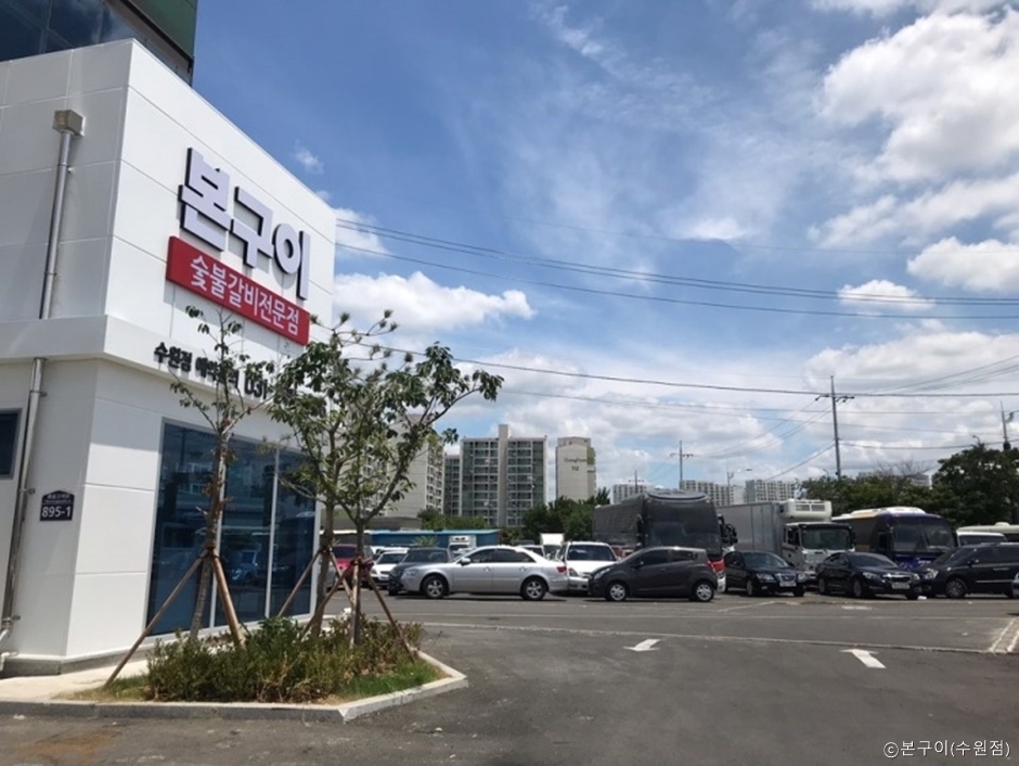 본구이 수원점은 수원역과 가까운 평동에 있다. 평동 골프존 건물 1층에 하얀색 간판으로 쉽게 찾을 수 있다. 건물 앞에는 큰 규모의 주차장이 있어 주차가 편리하다. 매장 입구에는 뽑기 기계들이 준비되어 있어 웨이팅이나 일행을 기다리며 즐길 수 있다. 내부에 들어가면 큰 규모에 테이블 수가 많고 아기 손님을 위한 아기 의자도 준비되어 있다. 이 식당은 숯불구이전문점답게 한상 세트 메뉴가 잘 구비되어 있다. 또한 점심 메뉴로 BON 정식과 여름 특선이 나뉘어 있고 오후 3시까지 이용할 수 있다. 고기 드시는 분들을 위해 매장 가운데에 셀프바도 준비되어 있다. 숯불 돼지 양념 구이는 포장하여 판매되고 식사 후 카운터 근처에서는 아이스크림이 판매되고 있다. 단체석이 있어서 가족외식이나 회식에도 인기가 많은 곳이다.