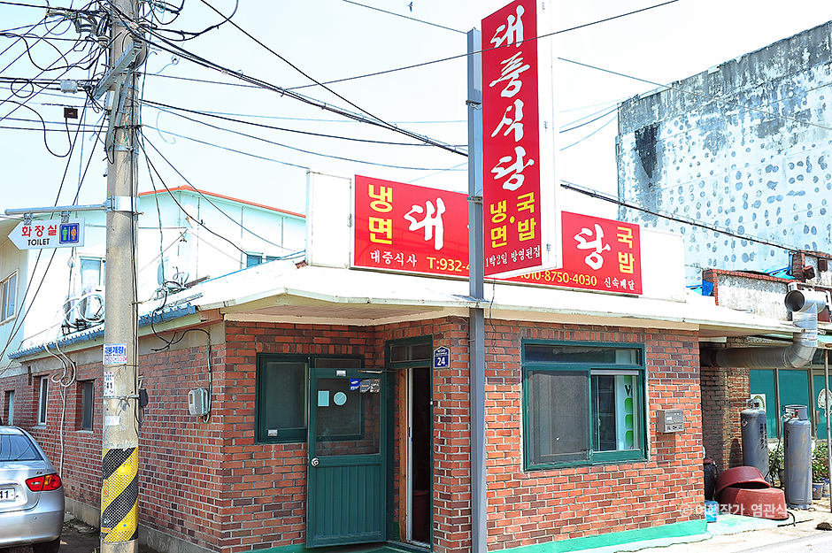 교동 면사무소가 있는 대룡리는 교동도의 중심지로 KBS <1박 2일>에 소개된 이후 외지인들에게 알려지기 시작했다. 교동도는 원래 민통선에 가까운 지역이라 그동안 발전과는 거리가 먼 낙후된 동네로 ‘시간이 멈춘 듯한 섬’으로 소개되곤 했다. 작년에 교동대교가 개통된 이후에는 주말마다 관광객들이 찾아오는 섬이 되었지만, 소재지에 위치한 대룡시장은 여전히 추억 속의 70~80년대 시장 분위기를 고스란히 간직하고 있다. 교동도에서 가장 오래된 50여 년의 역사를 지녔다는 대풍식당 골목 역시 옛 추억 속으로 거슬러 올라가게 하는 고적한 분위기다. 현재는 며느리가 30년 가까이 물려받아 운영하는 대풍식당의 메뉴는 단 두 가지, 국밥과 물냉면이다. 겨울에는 만둣국도 팔긴 한다. 순대와 돼지 창자 등 부속물을 넣어 끓인 국밥은 따로국밥 형태로 나오고 기본 간이 되어 있는 심심한 국물에 새우젓으로 간을 맞춰 먹는다. 야채로만 육수를 내는 냉면은 시어머니의 고향인 황해도 스타일이어서 교동도의 실향민들이 고향을 그리워하며 즐겨 먹는 음식이다.