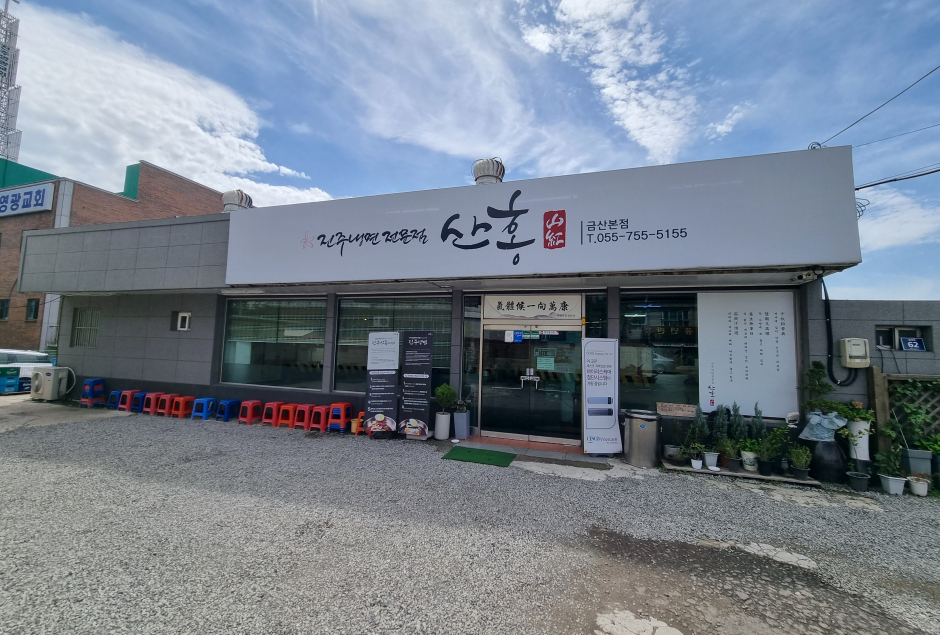 진주냉면 전문점 산홍은 진주의 교방 음식문화를 바탕으로 진주의 맛을 사람들에게 널리 알려주고자 문을 연 진주냉면 맛집이다. 진주냉면의 참맛을 느끼고 싶은 사람들은 식초나 겨자를 넣지 않고 먹는 진주냉면은 소고기 육전이 고명으로 들어 있어 식감이 독특하고 해물 육수 맛이 여느 냉면과 다르다. 이곳 메뉴 중 술안주로 먹기 좋은 진주 물갈비도 일품이다. 가족 모임이나 단체 회식 장소로도 최적화되어 있다.