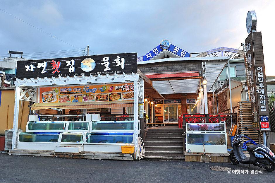 양양 수산항에 있으며 양양공항에서 차로 약 10분 거리다. 횟집 앞의 커다란 어항들이 먼저 손님을 반기며, 주인장이 직접 낚싯배를 타고 잡아온 진짜 자연산 회를 맛볼 수 있다. 다섯 개의 룸과 홀에서 강원도 특산품인 감자떡, 오징어순대, 자연산 골뱅이를 즐길 수 있으며 꽃새우와 닭새우도 일품이다. 모둠회와 물회도 인기 메뉴다. 빨간색 육수를 부어 먹은 뒤, 남은 육수에 소면을 말면 새로운 메뉴를 시킨 듯한 착각에 빠진다. 자연횟집은 그때그때 내놓는 밑반찬이 다른데 건조 도루묵을 조린 생선조림이나 두릅, 과메기가 나올 때도 있다. 주인 권영환 씨는 삼양호 선장이자 어촌계장, 한국자율관리어업 강원도연합회 회장이다. 횟집 입구에는‘어업인 후계자의 집’이라고 적혀 있다. 양양 어촌체험마을로 선정된 수산항은 요트대회가 열리는 곳으로도 유명하다. 산책하기 좋은 길과 포토존이 있고, 전망대에 오르면 시원한 바다를 조망할 수 있다. 가까이에 오산리 선사유적박물관, 아쿠아월드가 있어 양양의 가볼 만한 곳으로 손꼽히기도 한다.
