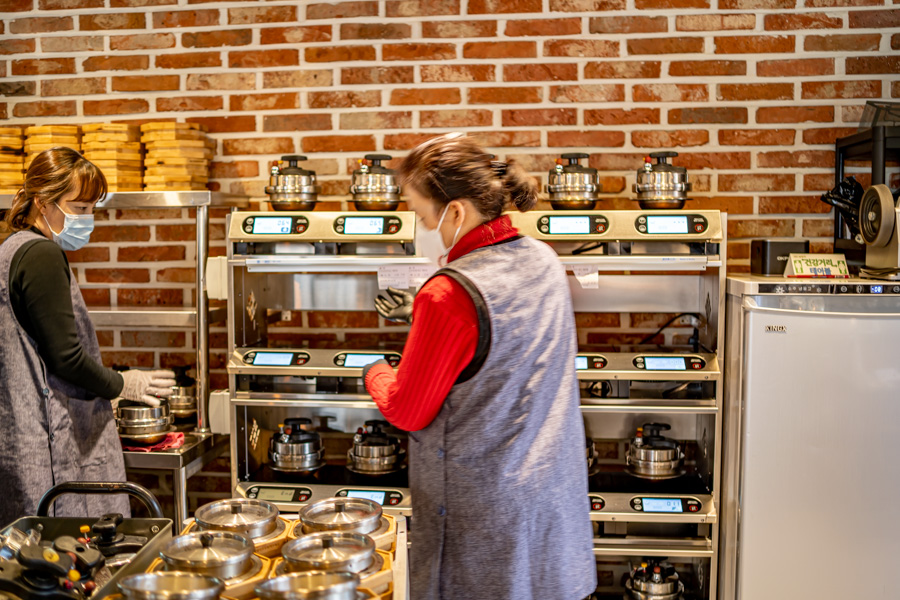 한국인이 즐겨 찾는 김치찌개, 돼지 두루치기가 주메뉴이다. 상호명 대로 솥에 갓 지은 밥이 나오고 물을 부어 숭늉과 누룽지를 만들어 먹는다. 간판과 벽면에 쓰인 '오늘도 웃자' 라는 문구가 신선하다. 널찍하게 트인 공간에 카페처럼 아늑하고 세련된 분위기 인테리어이다. 기본 밑반찬이 나오고 국 등 추가 반찬을 가져다 먹을 수 있는 셀프코너가 있다. 기다리면서 한쪽에서 줄지어 뜸 들여지는 솥 밥의 모습을 구경하며 기다릴 수 있다.