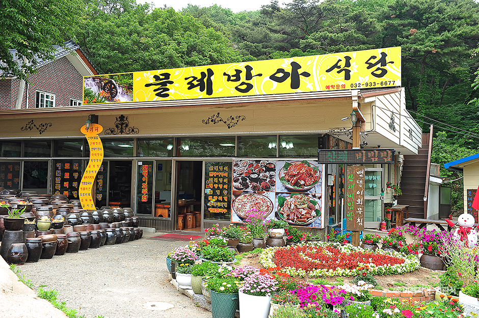 보문사 입구에 위치한 물레방아식당은 졸졸이 진열해 둔 항아리와 예쁜 화분으로 꾸민 식당 앞 풍경이 정겨워 보문사로 향하는 관광객들의 발길을 멈추게 한다. 특허를 낸 ‘새우백마리튀김’으로 유명한 이 식당은 원래 새우, 밴댕이, 꽃게, 쑥, 산나물 등 강화도의 특산물을 재료로 한 요리를 전문으로 한다. 강화도 축제의 대표 메뉴로 선정되기도 한 물레방아식당의 ‘새우백마리튀김’은 이름 그대로 백여 마리의 잔새우를 이용해 대하 튀김처럼 튀겨낸 것. 아삭한 느낌과 새우향이 어우러져 막걸리 안주로도 인기고 간식으로도 좋다. 산채비빔밥이나 더덕정식을 주문해놓고도 쉴 새 없이 튀겨내는 고소한 새우튀김 냄새에 절로 눈길이 가게 되어 있는데 다행히도 산나물 반찬과 함께 상 위에 오르니 맛을 볼 수 있다. 이 집에서는 보문사 인근에서 나는 두툼한 더덕에 고추장 양념을 묻혀 구운 더덕고추장구이를 메인으로 한 더덕정식, 표고버섯, 도라지, 고사리, 취나물 같은 산채가 오르는 산채정식, 짜지 않고 간간한 간장게장이 주인공인 게장정식이 주로 많이 나간다. 밴댕이 철에는 밴댕이회무침과 밴댕이비빔밥 같은 별미로 입맛을 돋게 한다. 4인 가족이라면 정식 한 상을 주문해 보자. 이 집의 대부분 메뉴가 한 상에 오른다.