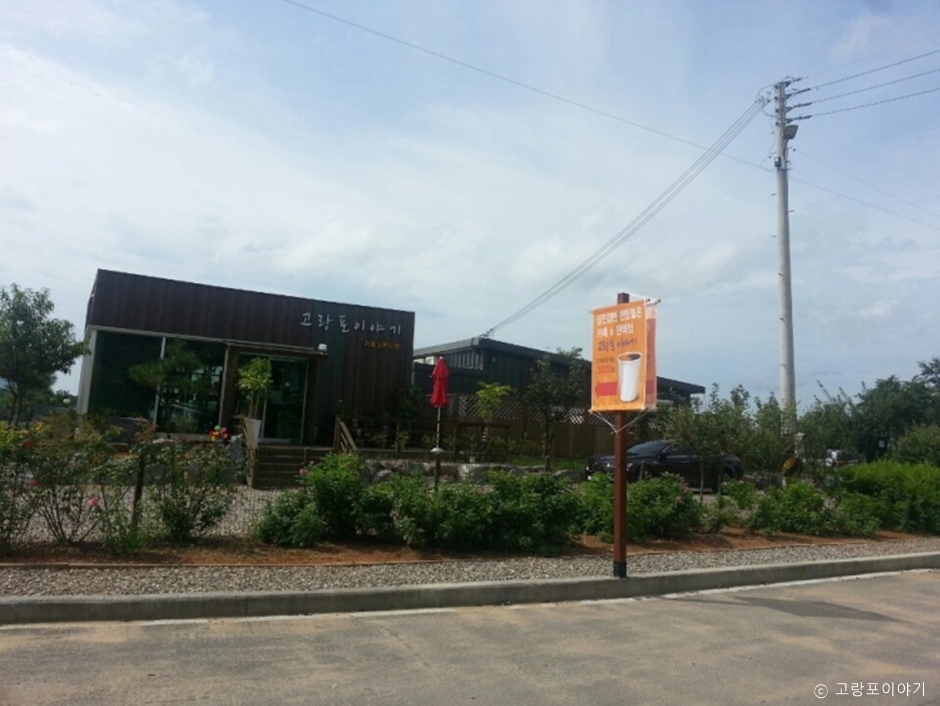 고랑포이야기는 고랑포구의 역사 및 안보 체험을 할 수 있는 연천 고랑포구 역사공원과 연천을 대표하는 고구려 3대 성 중 하나인 연천 호로고루의 중간에 있는 카페이다. 카페 입구에 들어서면 카운터를 지나 넓은 정원이 펼쳐진다. 작은 분수와 텃밭을 중심으로 강변을 따라 설치한 야외 테라스 등이 조성된 아름다운 정원이 있다. 야외 테라스 테이블에서는 임진강을 가까이서 조망할 수 있고 연천 호로고루도 한눈에 들어온다. 정원 한쪽으로는 조그마한 골프 연습장이 있다. 골프 연습장 쪽에도 실내 공간이 추가로 있다. 이곳은 공간도 널찍하고 테이블도 넉넉하여 훨씬 편안한 환경이다. 날이 좋지 않은 날에는 이곳 실내에서 임진강을 조망할 수도 있다.